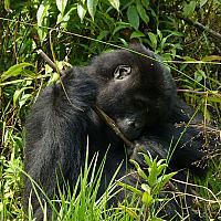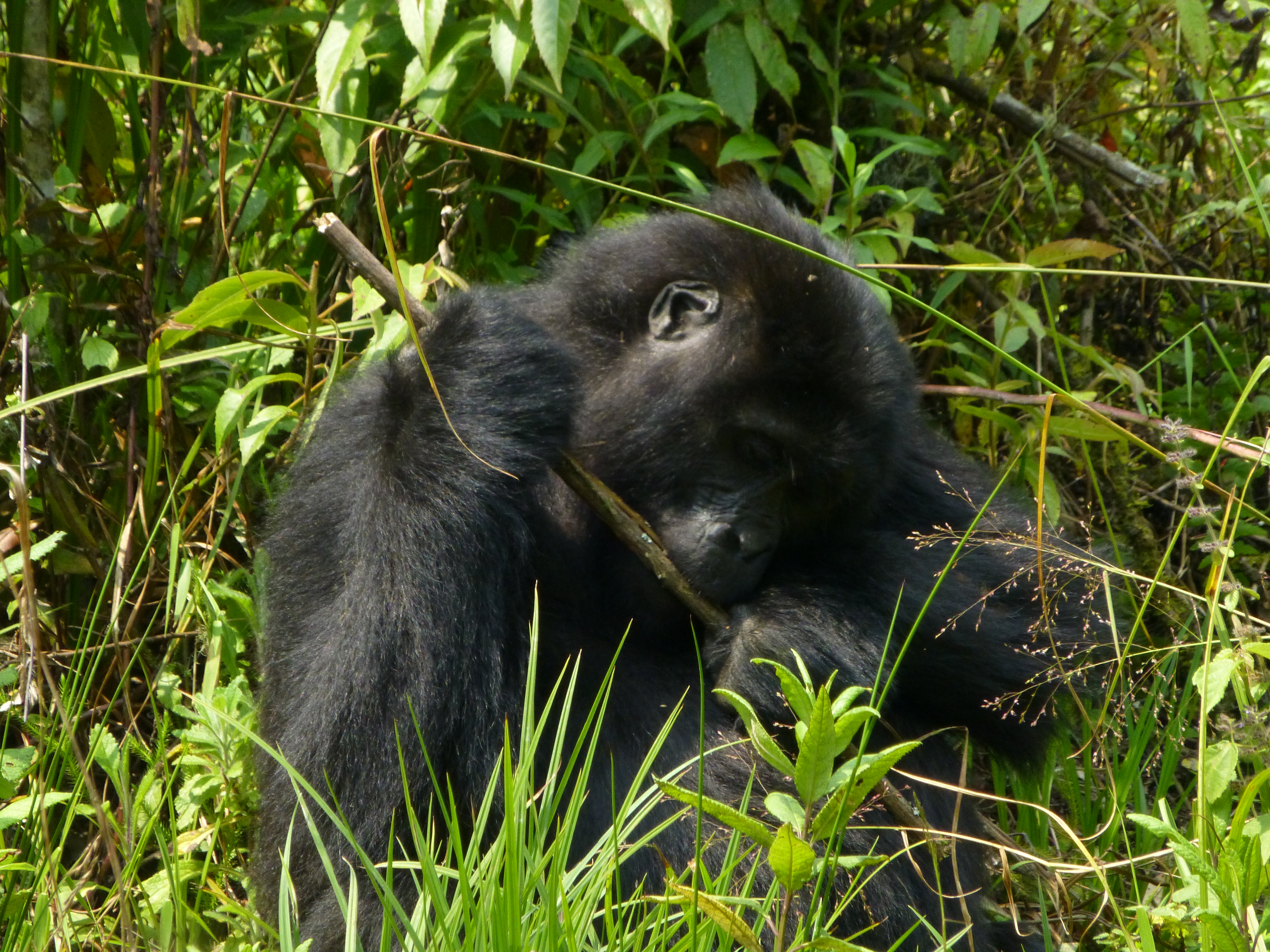 Etende Baby gorilla in het Bwindi Impenetrable Forest