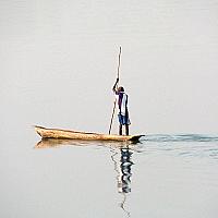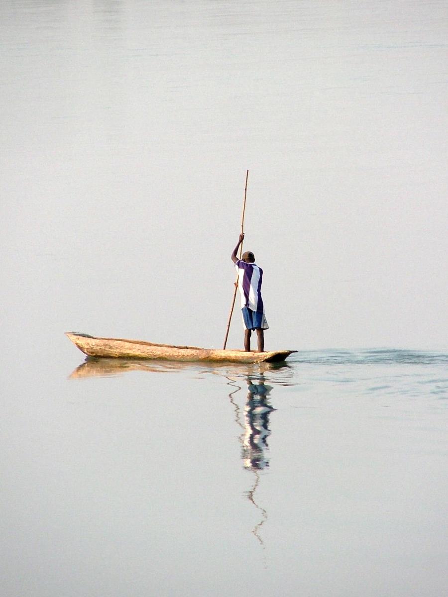 Terwijl ik genietend over de Zambezi tuur, zie ik een evenwichtskunstenaar op een drijvende pannenlat voorbij varen.