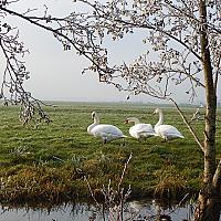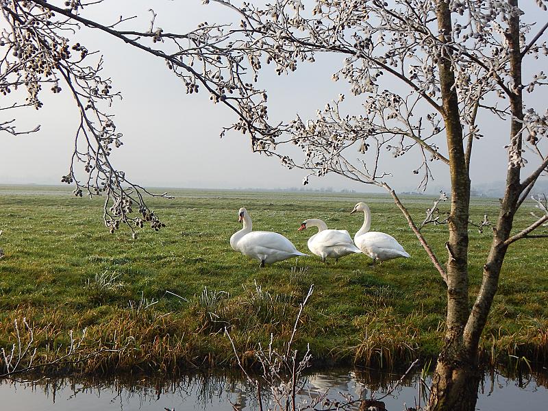 Een familie zwanen die ik tijdens een winterse wandeling tegen kwam. Met het zonlicht dat zich een weg baande door de mist en op hun borst scheen, de nog net niet smeltende rijp op de bomen, vond ik dit een heel mooi gezicht.