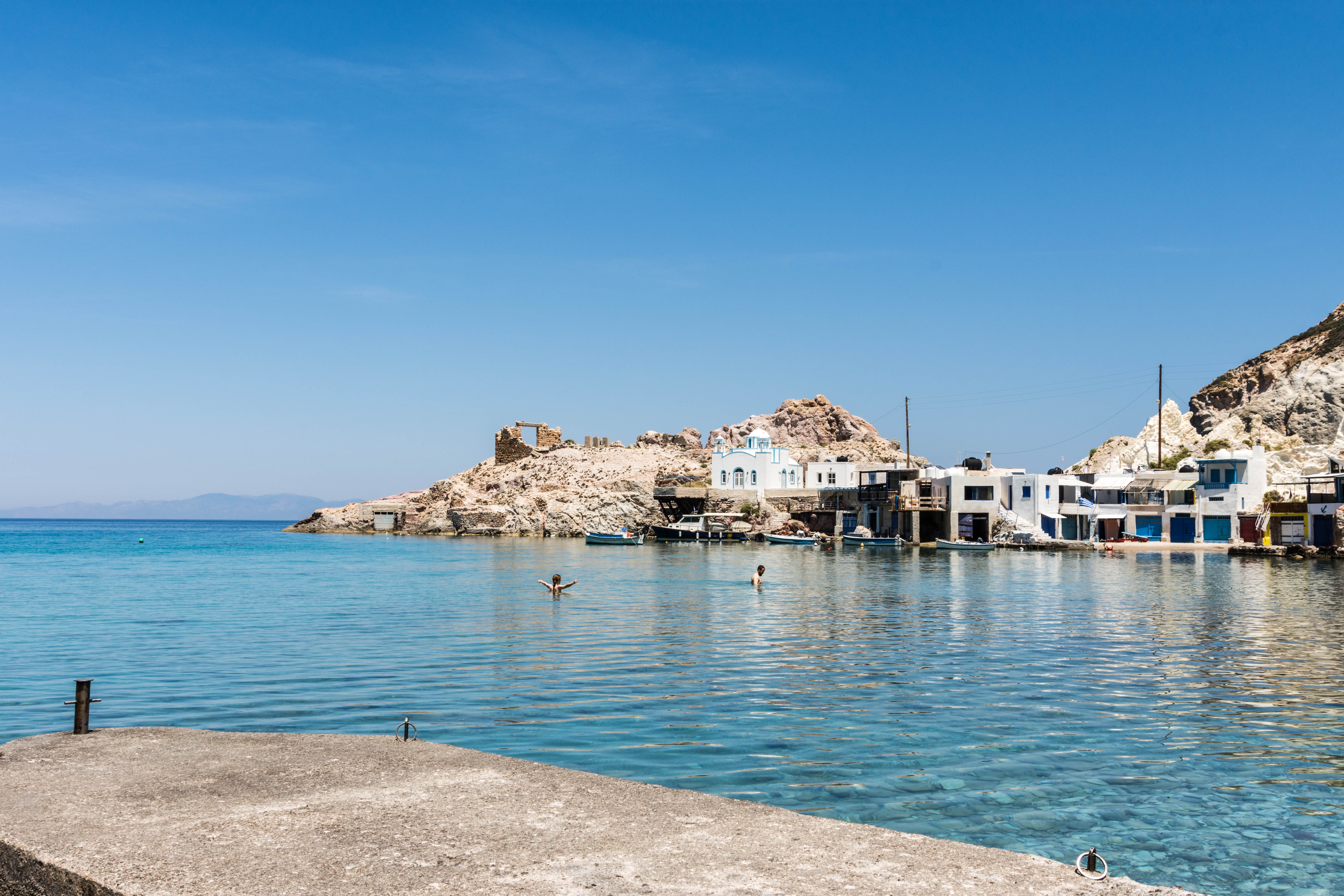 Deze foto straalt in alles vakantie uit: het blauwe water en dito lucht, de vrijheid van de twee mensen op de foto, de bergen en vissershuisjes...