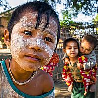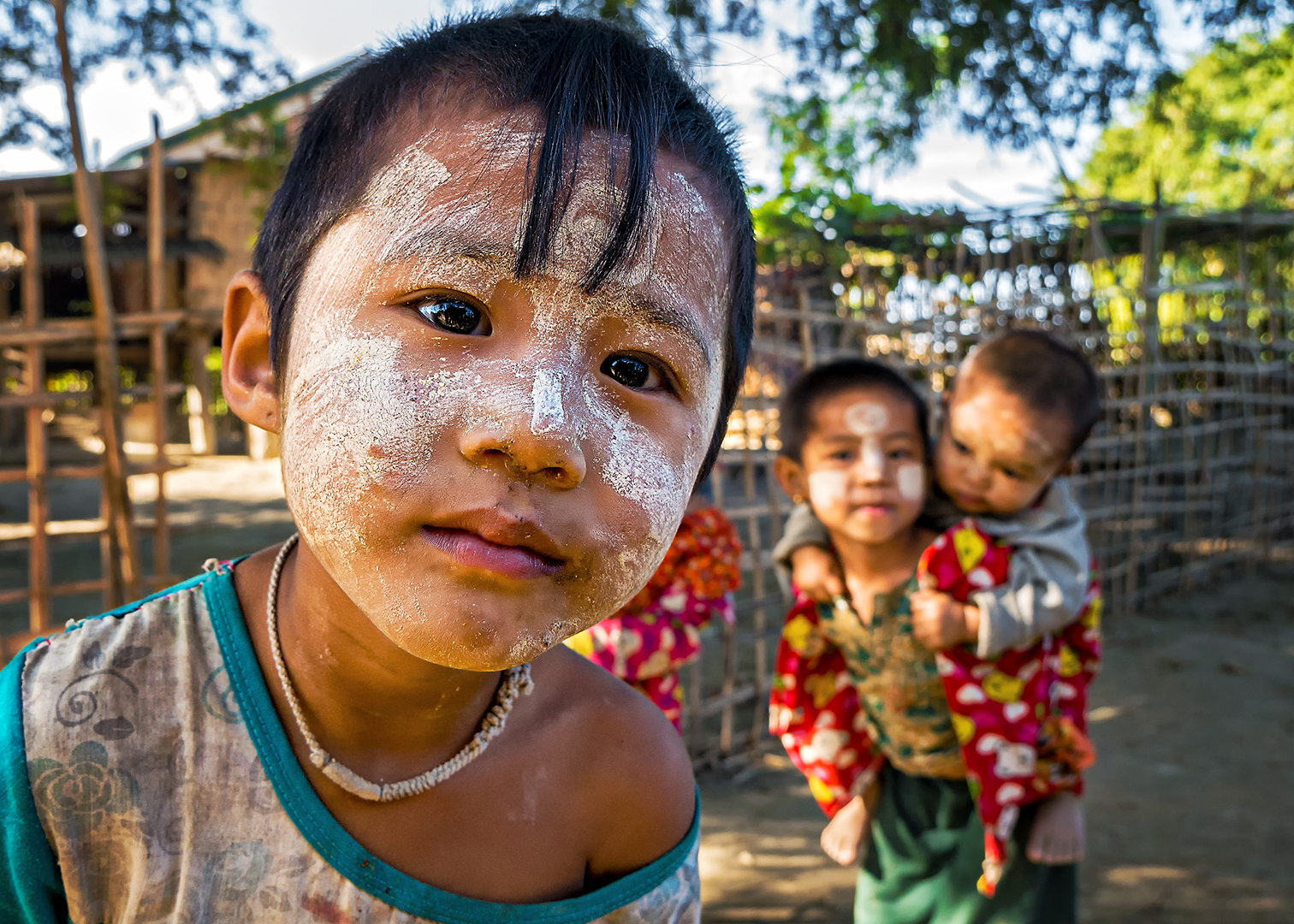 Tijdens een bijzondere 2-daagse tour door meerdere dorpjes langs een rivier buiten Mrauk U in Myanmar, bezocht ik oudere vrouwen met tatoeages in hun gezicht. Tussendoor werd ik keer op keer vrolijk benaderd door nieuwsgierige kinderen zoals dit jongetje. Kenmerkend voor Myanmar is de thanaka-schmink op het gezicht, met name bij vrouwen en kinderen.