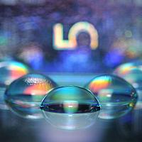 Vijf druppels gefotografeerd op een CD met een vijf Euro biljet in de achergrond.