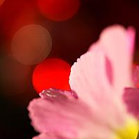 Macro tegenlichtopname van een Primula , Lensflares komen van glazen waxinelichten in de achtergrond.