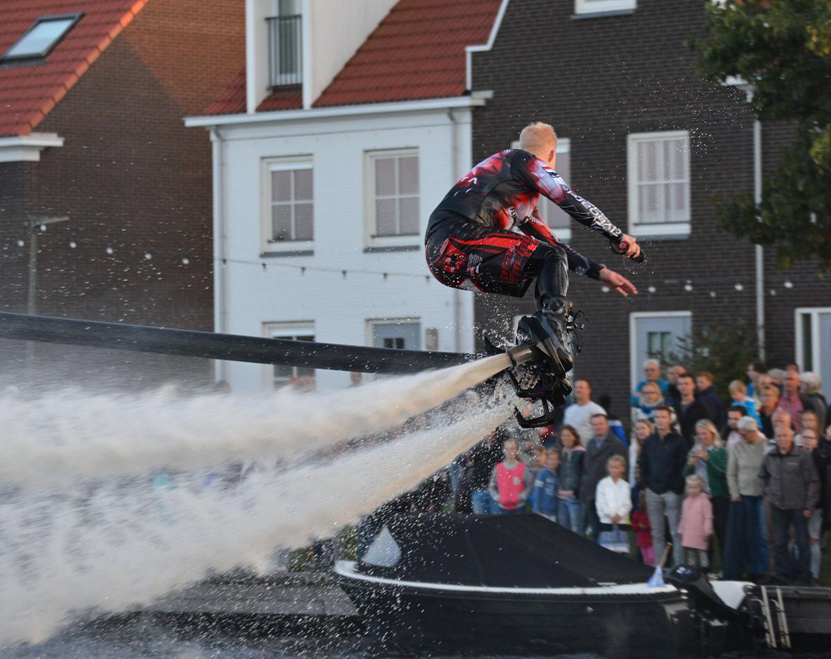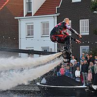 Super show tijdens de Ballon Fiësta Meerstad in Groningen. De flyboarder maakt gebruik van een jetski waarmee hij verbonden zit door de zwarte slang die je op de foto ziet. Via de slang wordt er heel veel water doorheen gepompt waardoor hij salto's kan maken en heel hoog in de lucht kan komen. Mooi gebruik maken van water :)