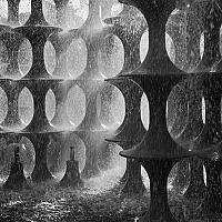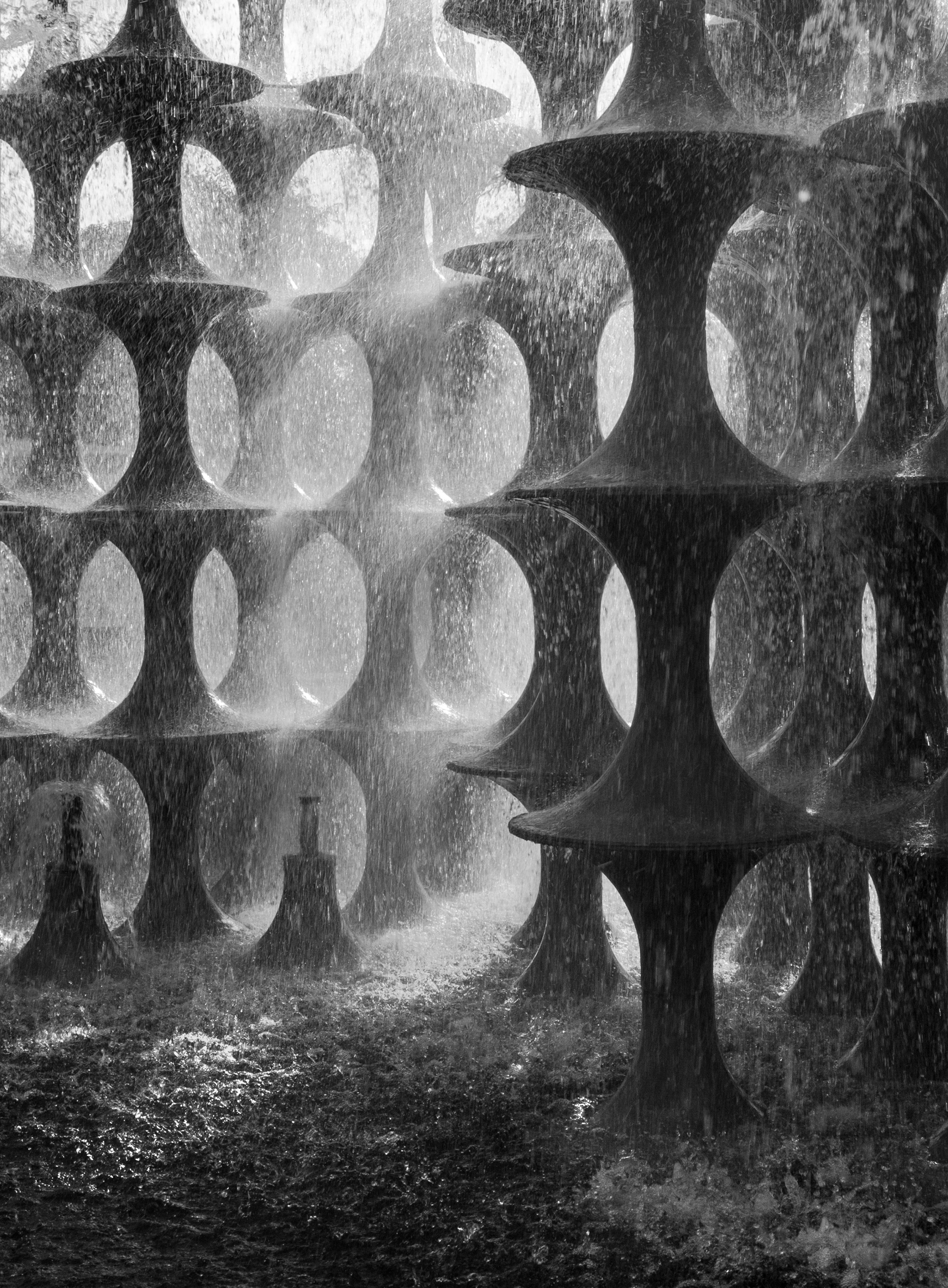 Het water maakt de sfeer in de foto, vooral in combinatie met het tegenlicht en de futuristische herhalende vormen van de fontein. Overal zijn vallende druppels te zien, het lijkt op een potloodtekening.