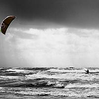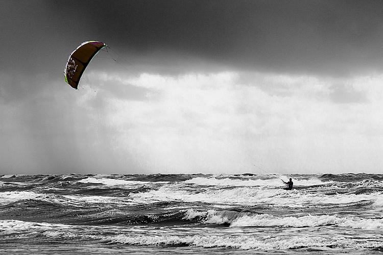 Kitesurfen bij windkracht zes. Prachtig voor kitesurfers, zware beproeving voor mijn camera.
