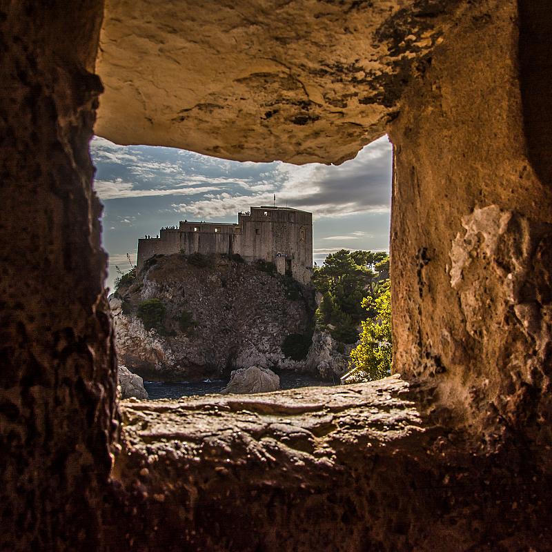 Het fort in Dubrovnik gezien doorheen de stadsmuren van de oude stad