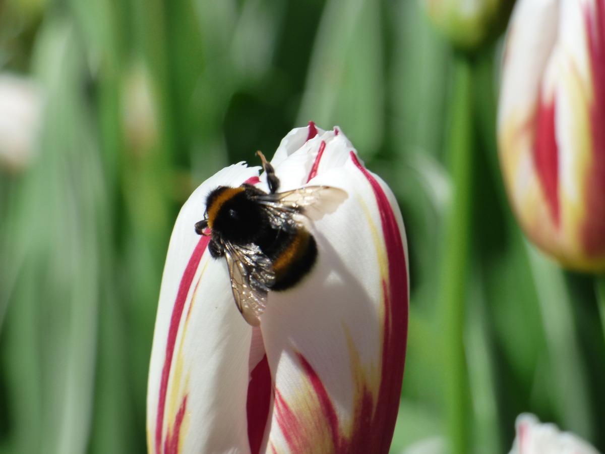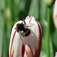 Deze bij had het heerlijk naar zijn zin op deze tulp.