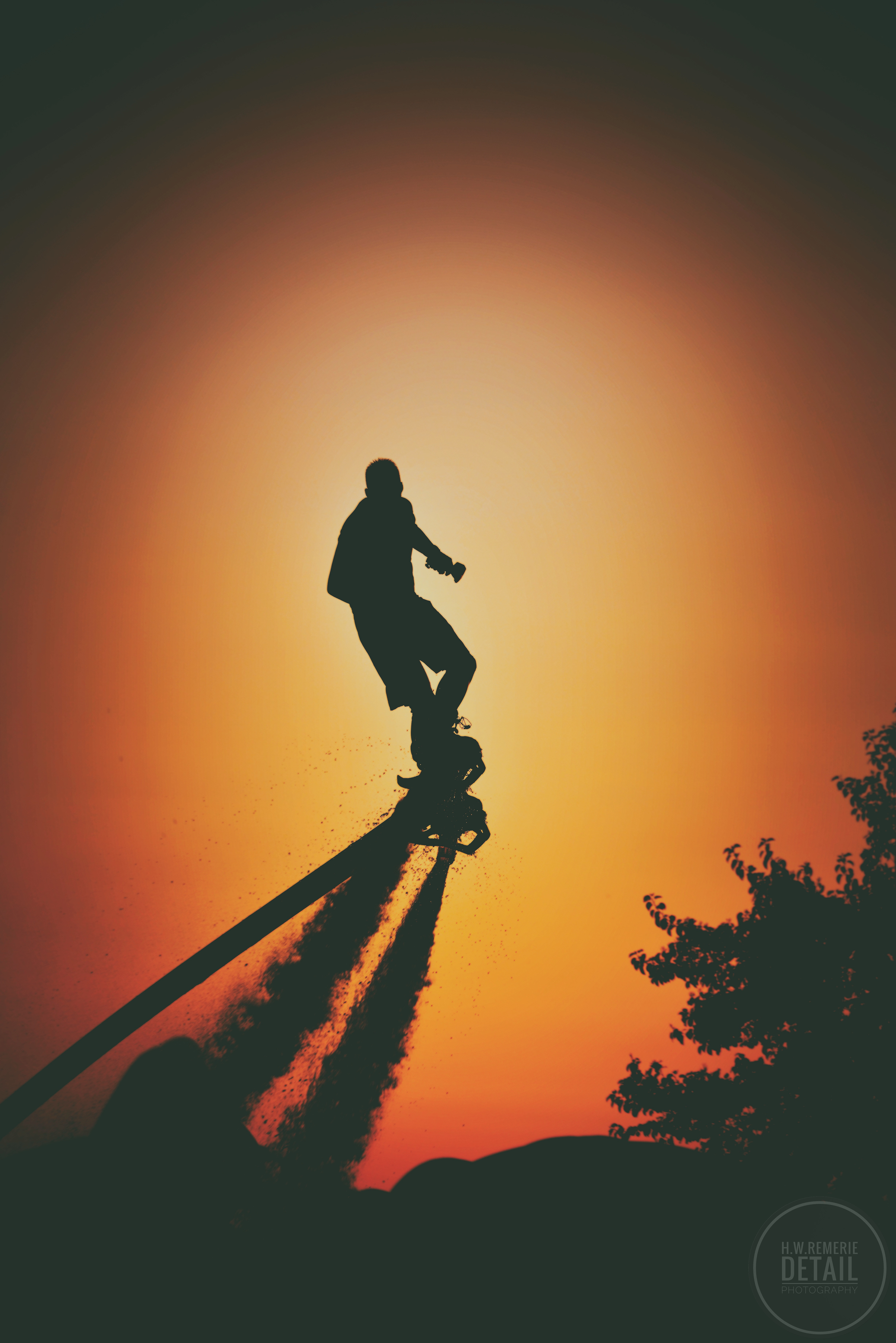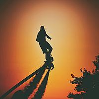 Flyboard show met ondergaande zon tijdens de ballon fiësta in Meerstad Groningen.