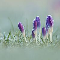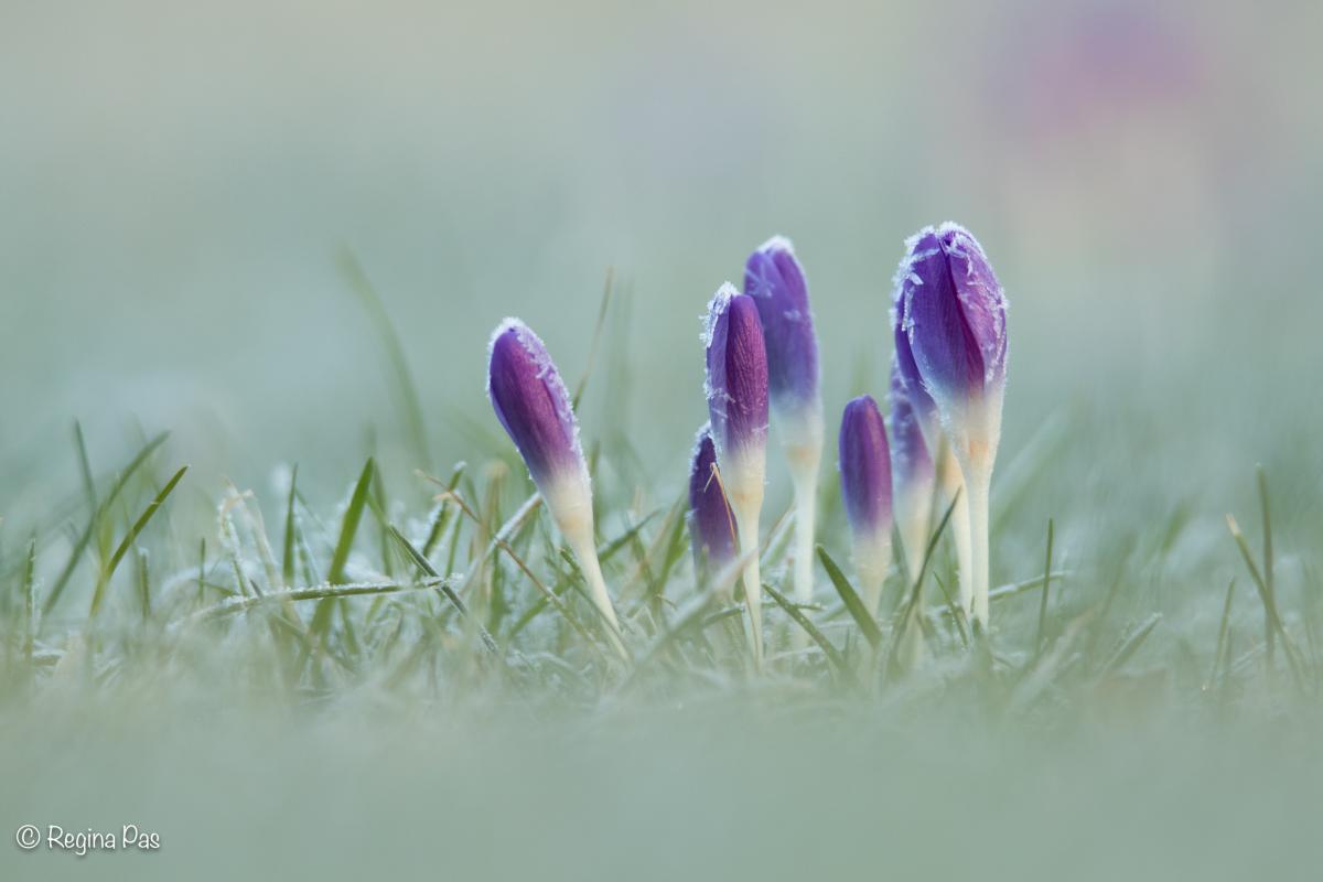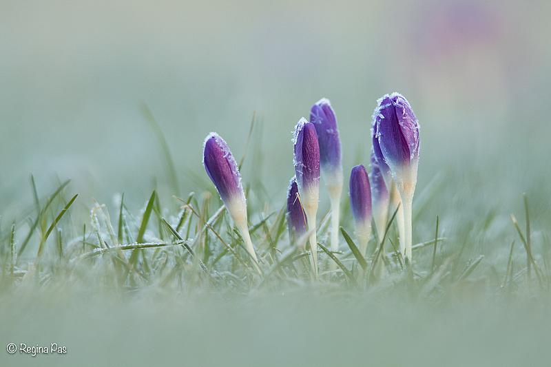 Krokussen kondigen het voorjaar aan, de winter geeft ze nog een mooi ijslaagje mee.