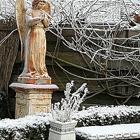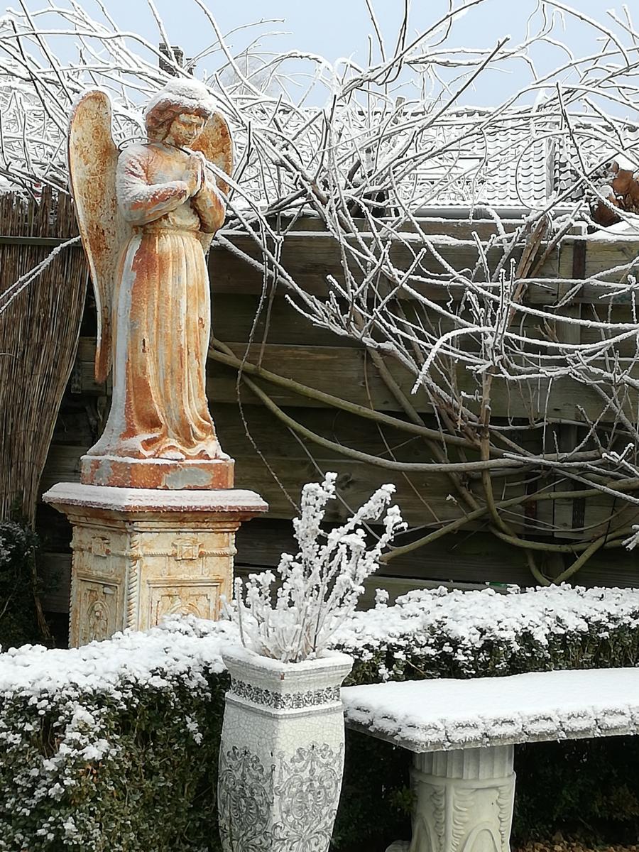 In tuin van de buren staat deze engel, ingetogen met gevouwen handen te midden van de sneeuw.