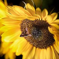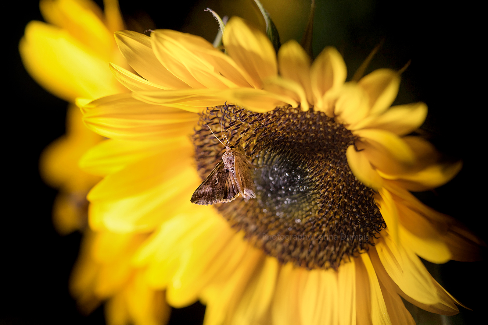 In de nacht worden mijn zonnebloemen rijkelijk bezocht door nachtvlinders. Bij deze zonnebloemen zijn de Gamma-Uilen druk bezig om de nectar tot zich te nemen.(Nachtfotografie)