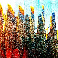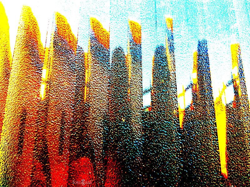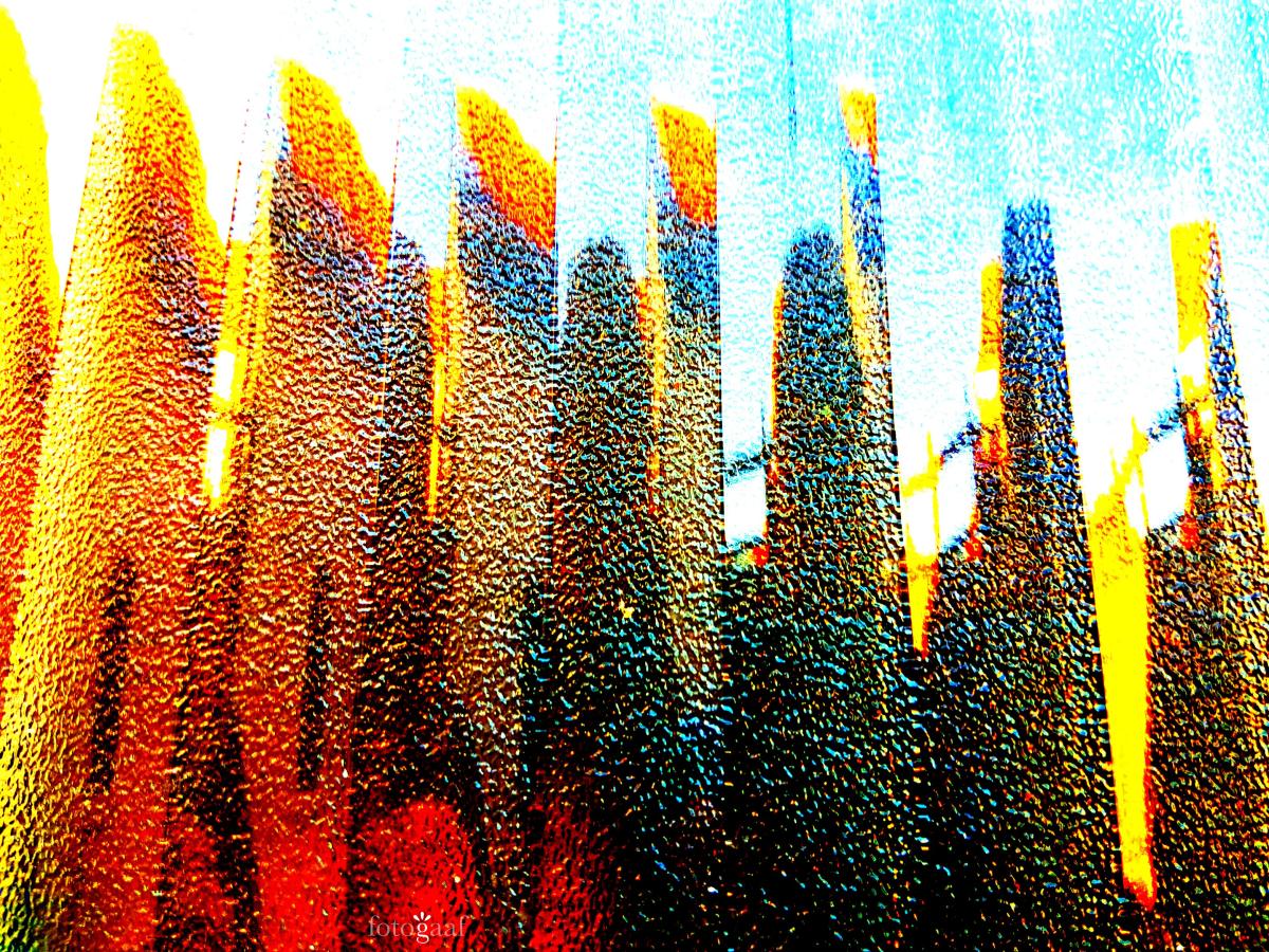 Je ziet hier een spiegeling in het golvende gevelglas van een raam waardoor de foto letterlijk in stukjes is geknipt en je steeds een ander stukje van de spiegeling ziet.