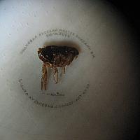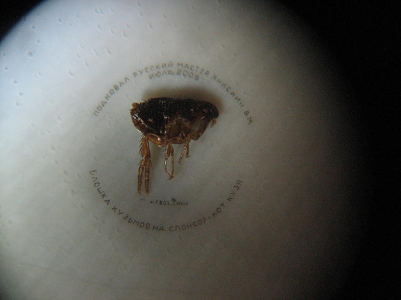 The photo is made via the microscope. It is shod flea. Two salutatory legs of a real flea are shod with horseshoes made of special dye with nails made of steel. The width of the horseshoes is 60 microns (0,06 mm).
