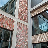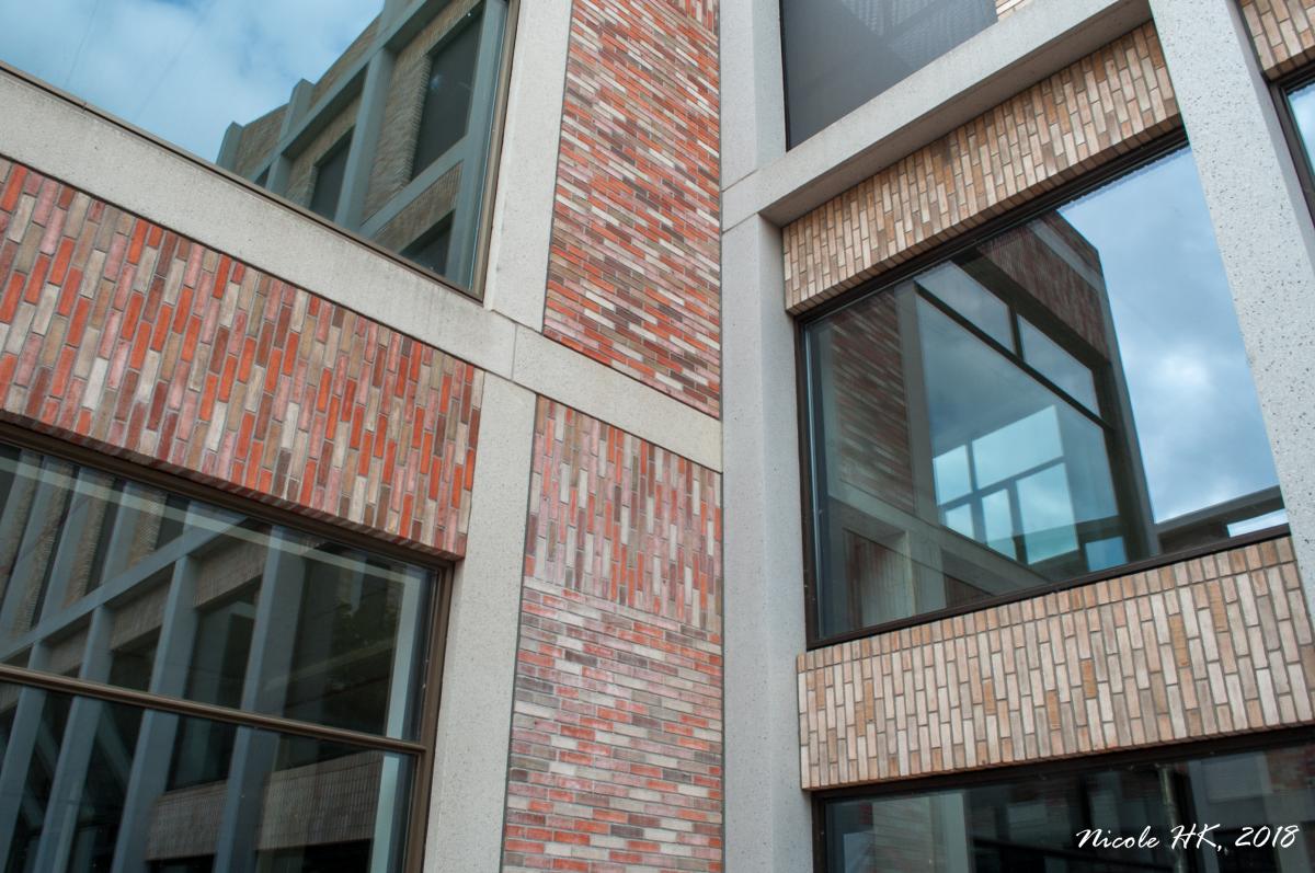 Hoek van gedeeltelijk leegstaande nieuwbouw in Sittard met spiegelingen van het gebouw zelf.