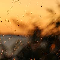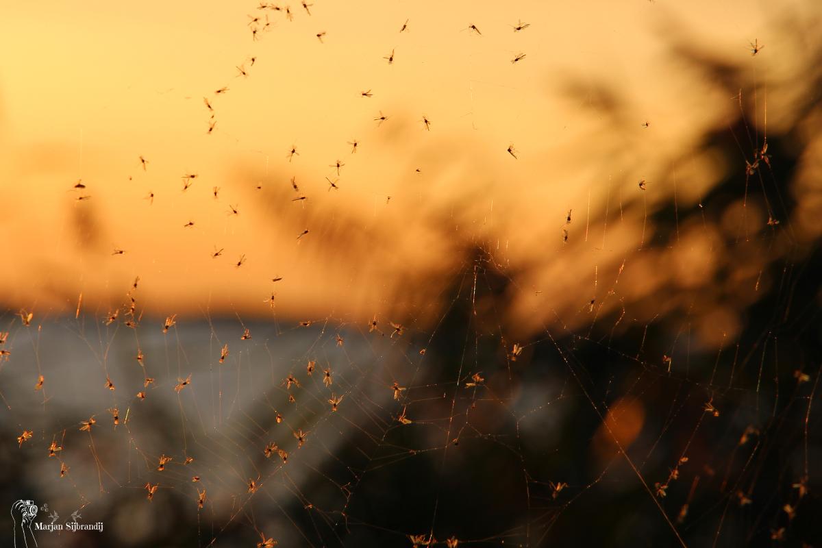 Gevangen in het web, Zonsondergang, vliegjes en spinnetjes.