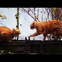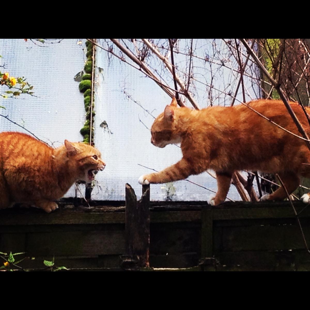 Zondagmorgen werd ik wakker van het gemiauw van drie katten die met elkaar aan het vechten waren. Op de schutting trof ik deze twee aan. Met mn iphone gemaakt en stevig ingezoomd.