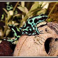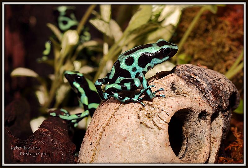 Nog een foto van onze gifkikkers. Ik ben persoonlijk vooral trots op de compositie. De kikkers die op de achtergrond staan, één die de andere kant op kijkt en de andere richting de camera, geven de foto een mooi afgewerkt geheel. De mooie volle kleuren zijn verkregen d.m.v. een polarisatiefilter.