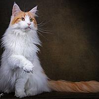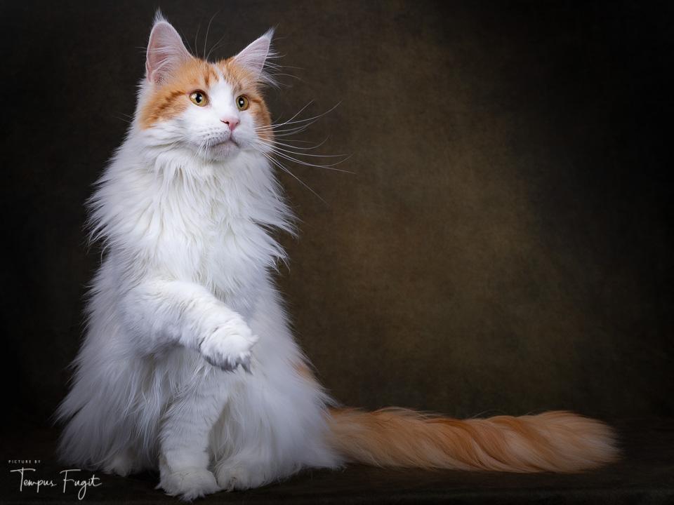 Vinger opsteken kan ze niet, maar ze laat met haar pootje even weten dat ze aandacht wil. Ginger is een Maine Coon poes en poseert hier schitterend in mijn thuisstudio.
