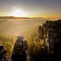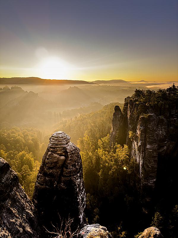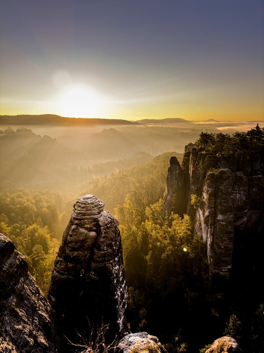 De foto werd genomen bij zonsopgang aan de basteibrücke in het sachsische schweiz.