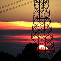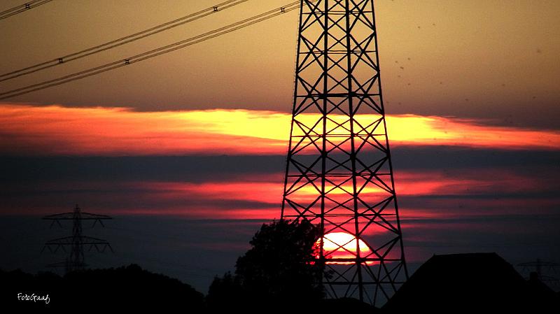 Elke avond gaat de zon onder, voor niets. De ene avond verloopt dit (visueel) mooier dan de andere avond. En nu... was het kleurrijk door de aanwezige bewolking. Rond 21.30 uur het laatste stukje van de zon zichtbaar, deels achter de lage bewolking en prachtig 'gevangen' in het metalen frame van de electriciteitsmast.