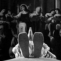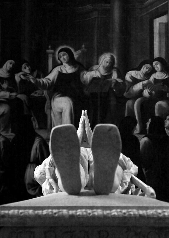 Door aan deze kant van de tombe te gaan staan, en zo in te zoomen en te kaderen, vloeien deze twee objecten (de graftombe en het schilderij dat er achter hangt) samen tot één nieuw beeld. Door de omzetting naar zwart wit lijkt het net een echt persoon dat daar ligt, maar het is toch gepolijst steen.