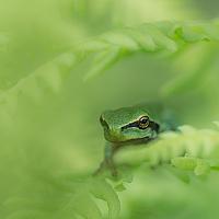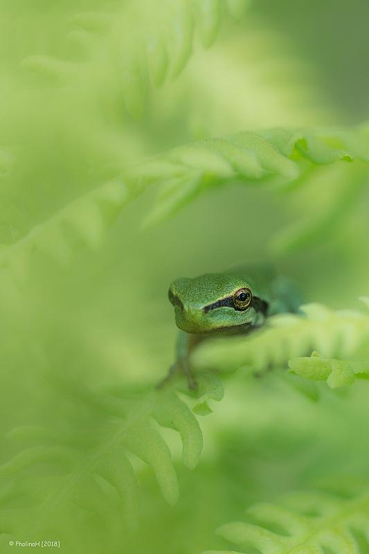 Moeilijk te spotten zo'n 1 1/2 cm klein boomkikkertje tussen de groene varens