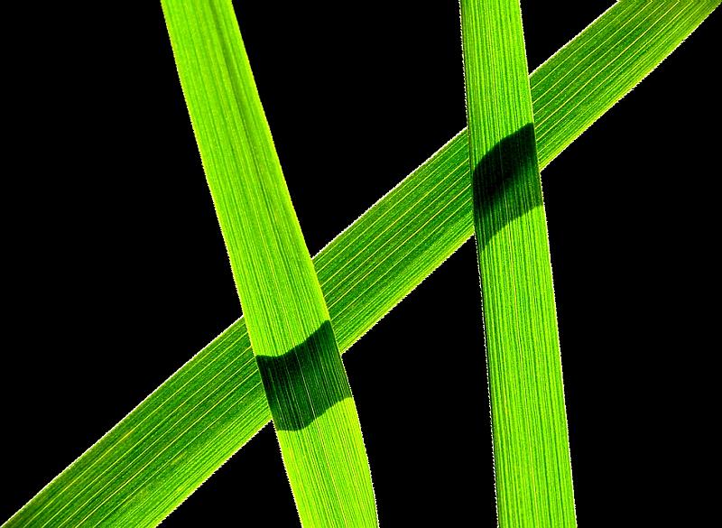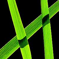 Twee, elkaar kruisende, grassprieten in zonlicht. Een mooi effect ontstaat door de kleine blokvormige schaduwpartijen.