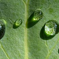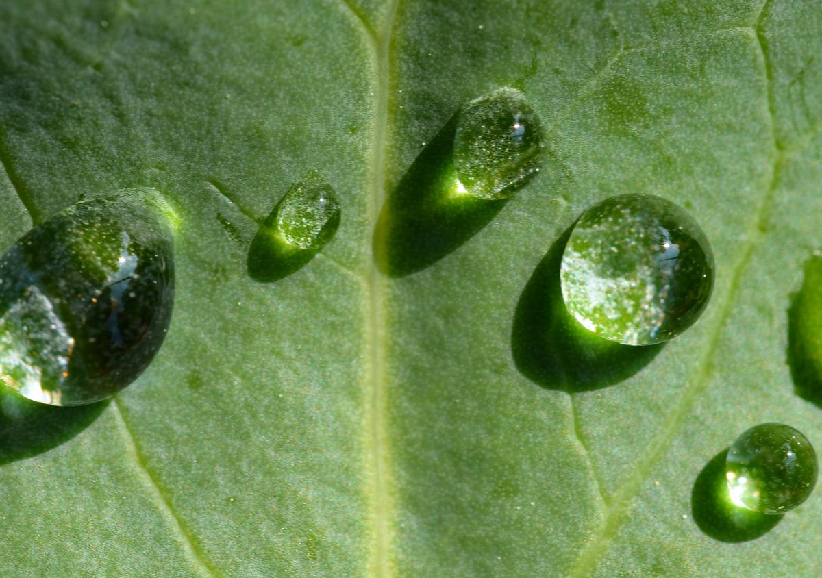 druppels op een blad, werken als een klein vergrootglas.