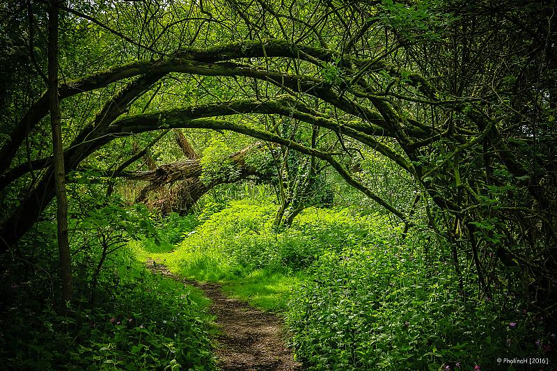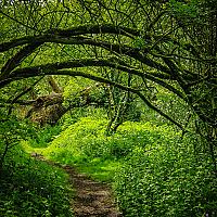 Omgevallen boom overwoekerd met groen. De overhangende takken zorgen voor een fraai doorkijkje.