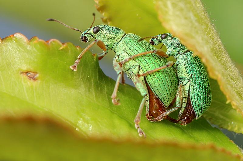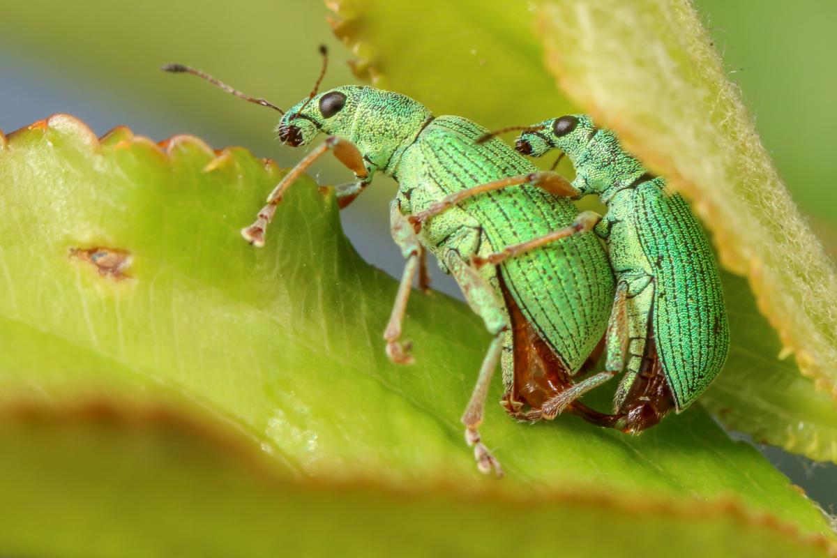 Dit stelletje Groene Struiksnuitkevers zat verscholen onder een blaadje.