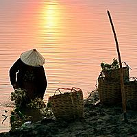 Groente wassen in de mekong rivier in Vientianne te Laos