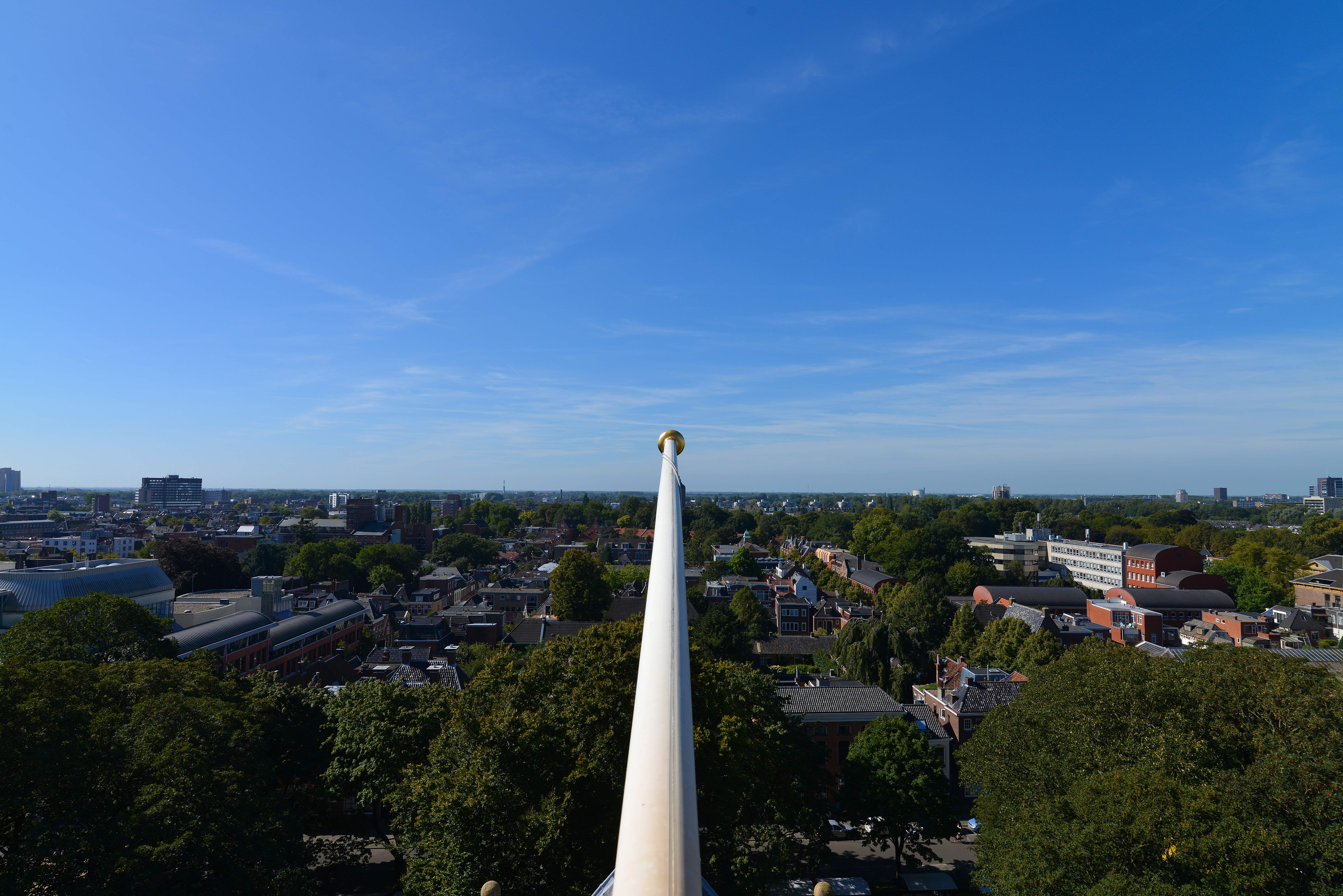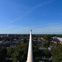 Gezien van boven af de Nieuw Kerk gelegen aan de nieuwe Boteringestraat in Groningen.Het was een heel avontuur om er bovenin te komen, via kleine houten trapjes die zeer steil waren. Ook helemaal hier boven had je maar een klein stukje waar je kon staan en je kon zo naar beneden kijken. Zou je niet zo naar het einde van de vlaggenstok willen lopen?