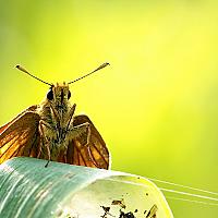 Op pad om een koninginnepage te spotten. Helaas niet gezien, maar wel deze kleine rakker. Een groot dikkopje. Zittend op een riet blad, genieten van het ochtendzonnetje. En dan hopen op zo'n mooie achtergrond, want de foto is tegen de zon in genomen.