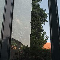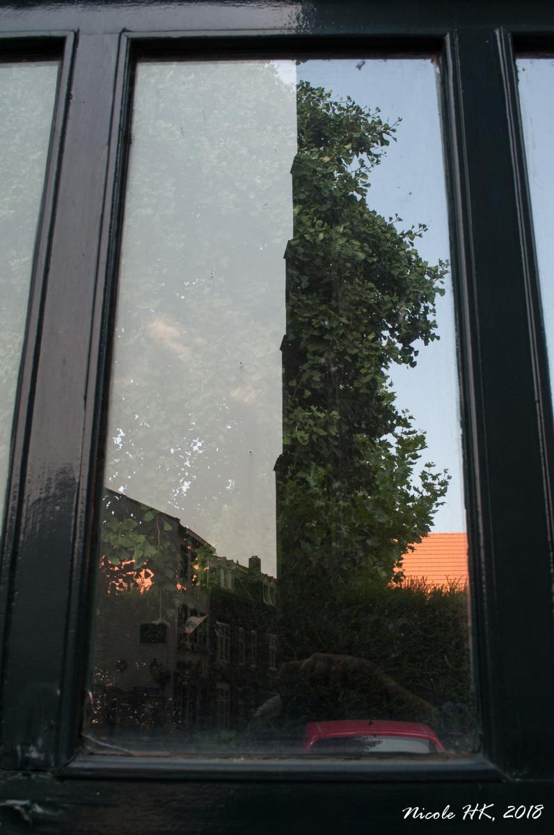 Het raam van een poort waarin gedeeltelijk stadswoningen en de kerk in worden gespiegeld en waar gedeeltelijk doorheen wordt gekeken.