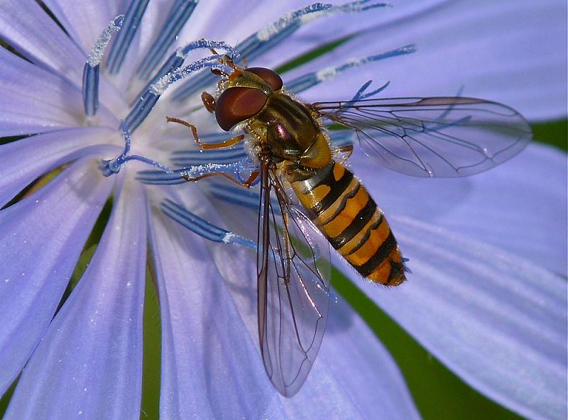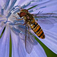 Een zweefvliegje van een paar millimeter, uit de hand gefotografeerd.