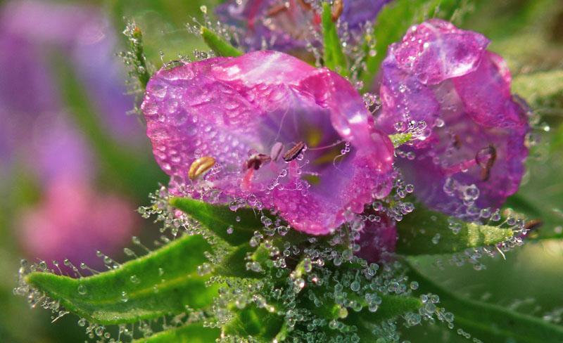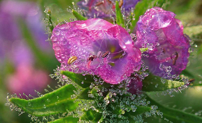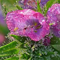 Heel klein bloempje met dauwdruppels