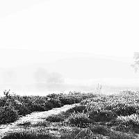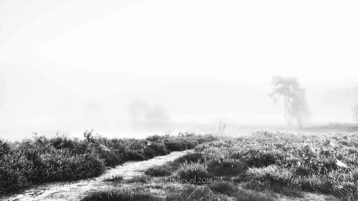 Heide landschap van de hatertsevennen in zwart wit bij mist.