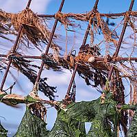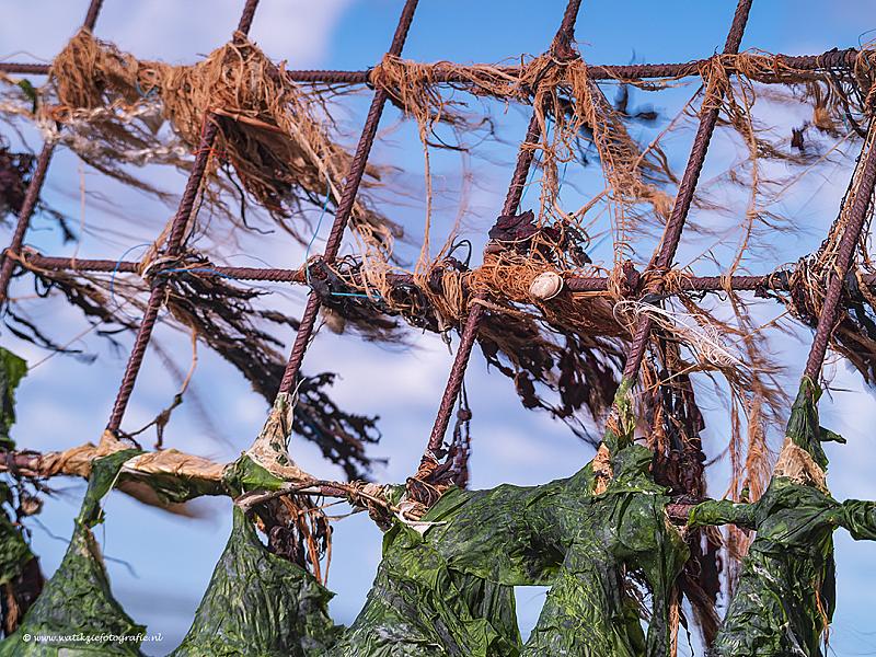 Een hek met van alles wat er uit de zee kan komen. Zeewier, schelpen, touw, schapenwol.....en dat tegen een mooie wolkenlucht.