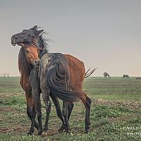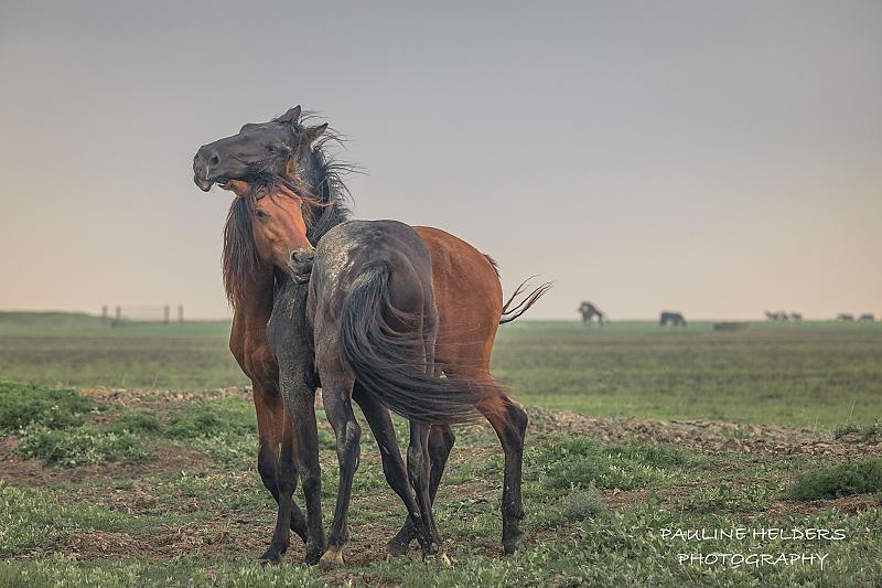 In het fraaie kwelderlandschap bij de Waddenzee (Friesland) trof ik een grote groep hengsten waarvan enkele dieren met elkaar aan het dollen waren