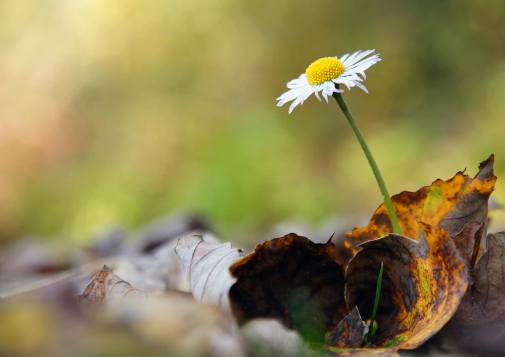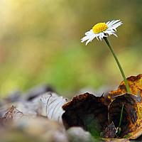 De Latijnse naam voor madeliefje is Bellis perennis, en betekent: mooi, het hele jaar door. dat bewijst dit eenzame bloemetje tussen de dorre herfstbladeren.