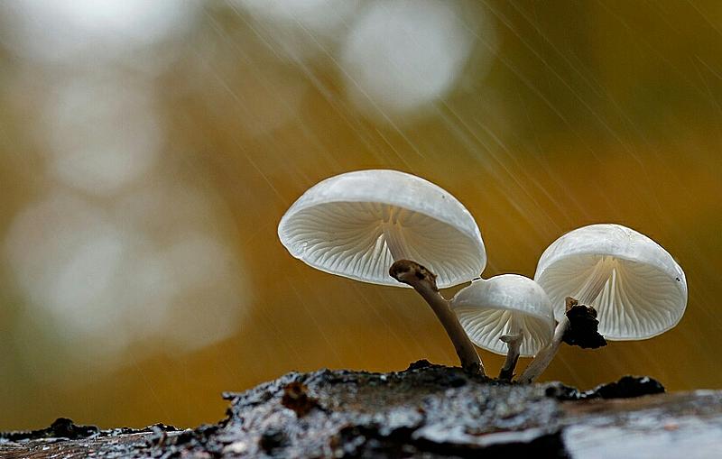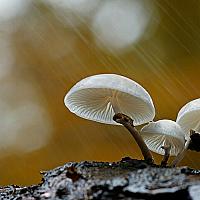 Een groepje porseleinzwammen in de regen vastgelegd.Voor een snelle sluitertijd gekozen om de druppels in beeld te brengen.