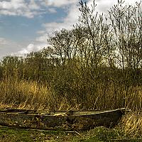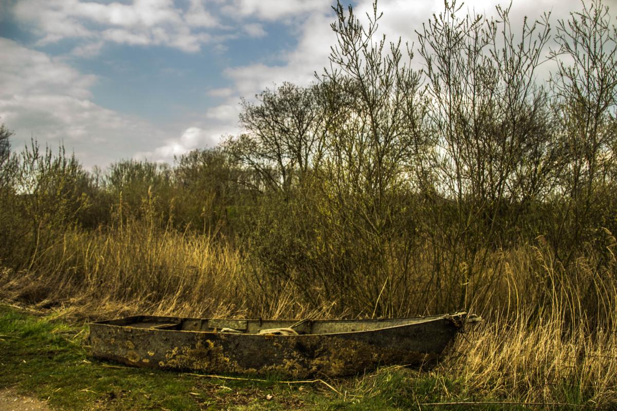 Een verlaten bootje langst een rustig meer.