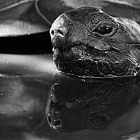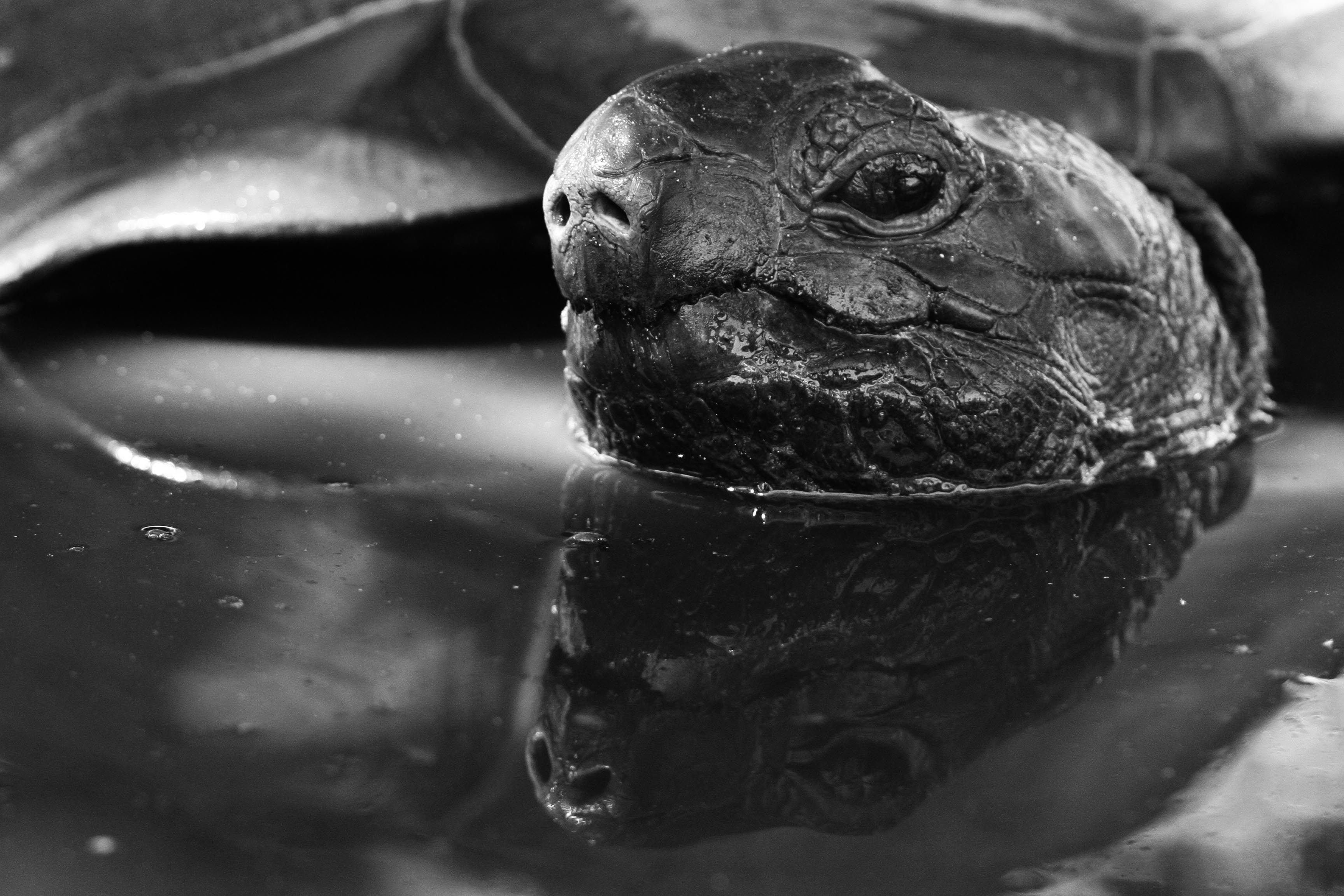 Deze karakteristieke kop van een Aldabra Giant Tortoise (Aldabrachelys elephantina) kwam tot stand omdat de oude reus het niet prettig vond dat ik zijn modderbad verstoorde. Al bubbelend probeerde hij mij te waarschuwen: Tot hier en niet verder!