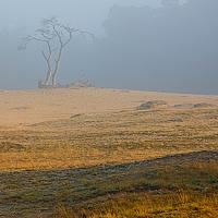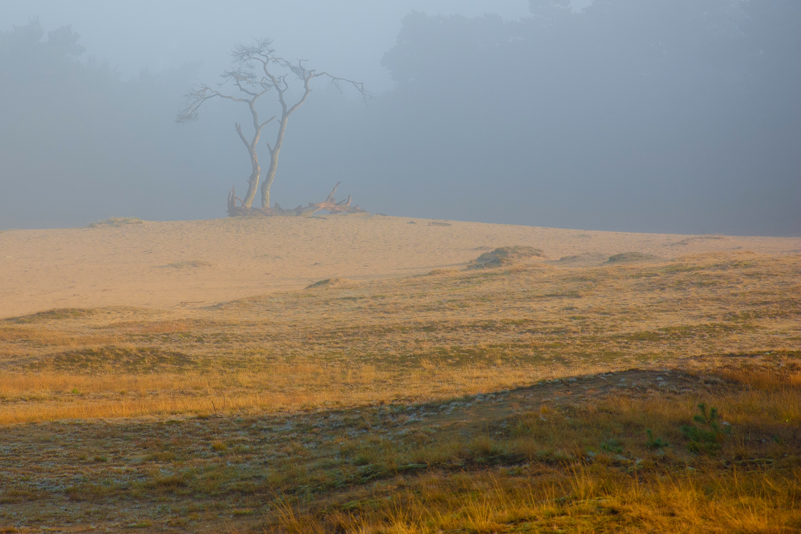 Op de terug weg over de zandverstuiving het Mosselsezand was het sollitaire berkje nog in lichte nevel gehuld terwijk de voorgrond al prachtig beschenenwerdt ddor de zon