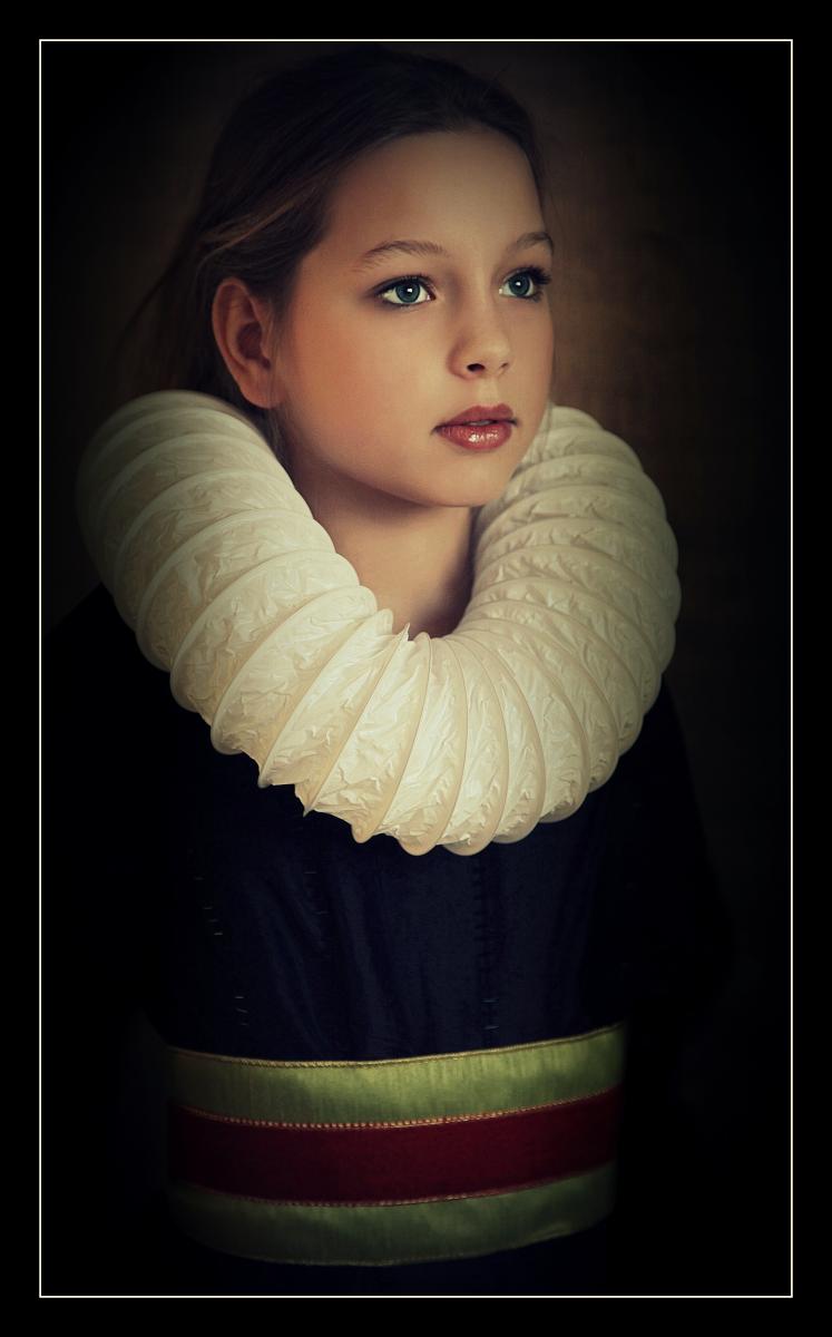 Dit is mijn " Meisje van de Gouden Eeuw" . Vind de schilderijen uit die tijd prachtig, dat schitterende licht. Ook dit is natuurlijk daglicht en met de bewerking de omlijsting donkerder gemaakt.