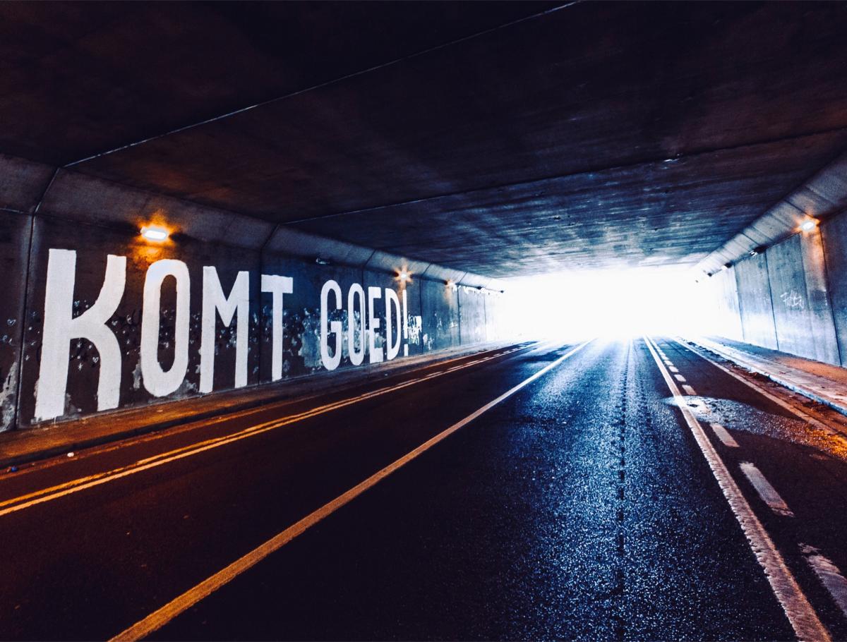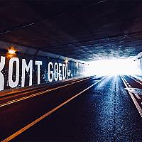 Boodschap in de tunnel die leidt naar UZ Gasthuisberg, Leuven, het grootste ziekenhuis van België
