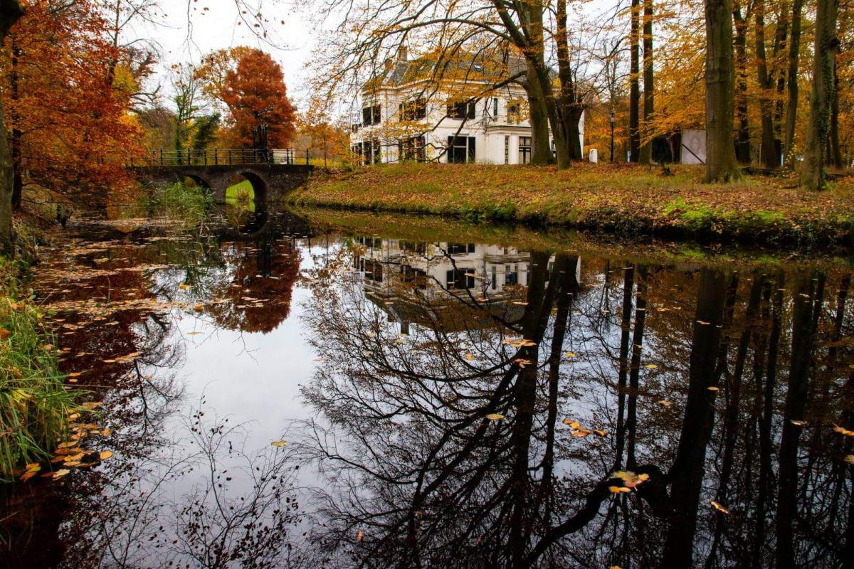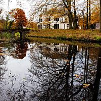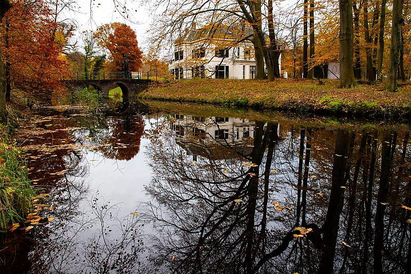Spiegeling van herfstkleuren en het congrescentrum in Bergen