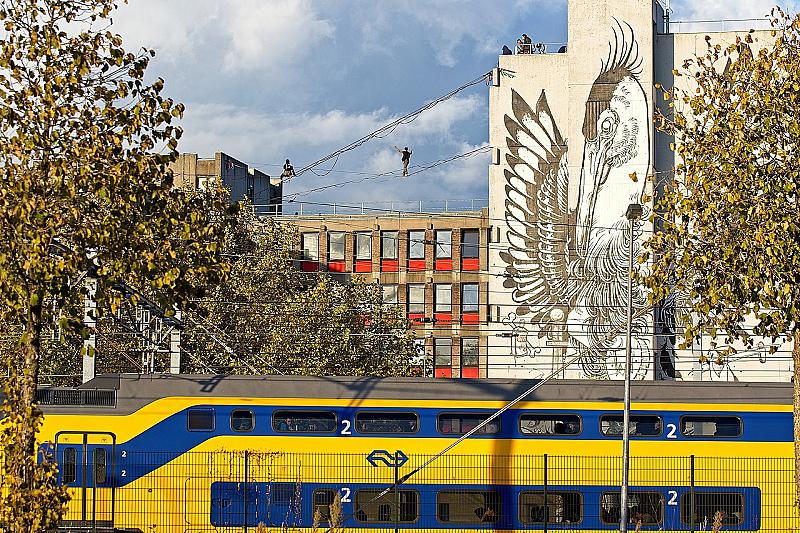 Highliners balanceren op een touw tussen de gebouw