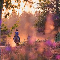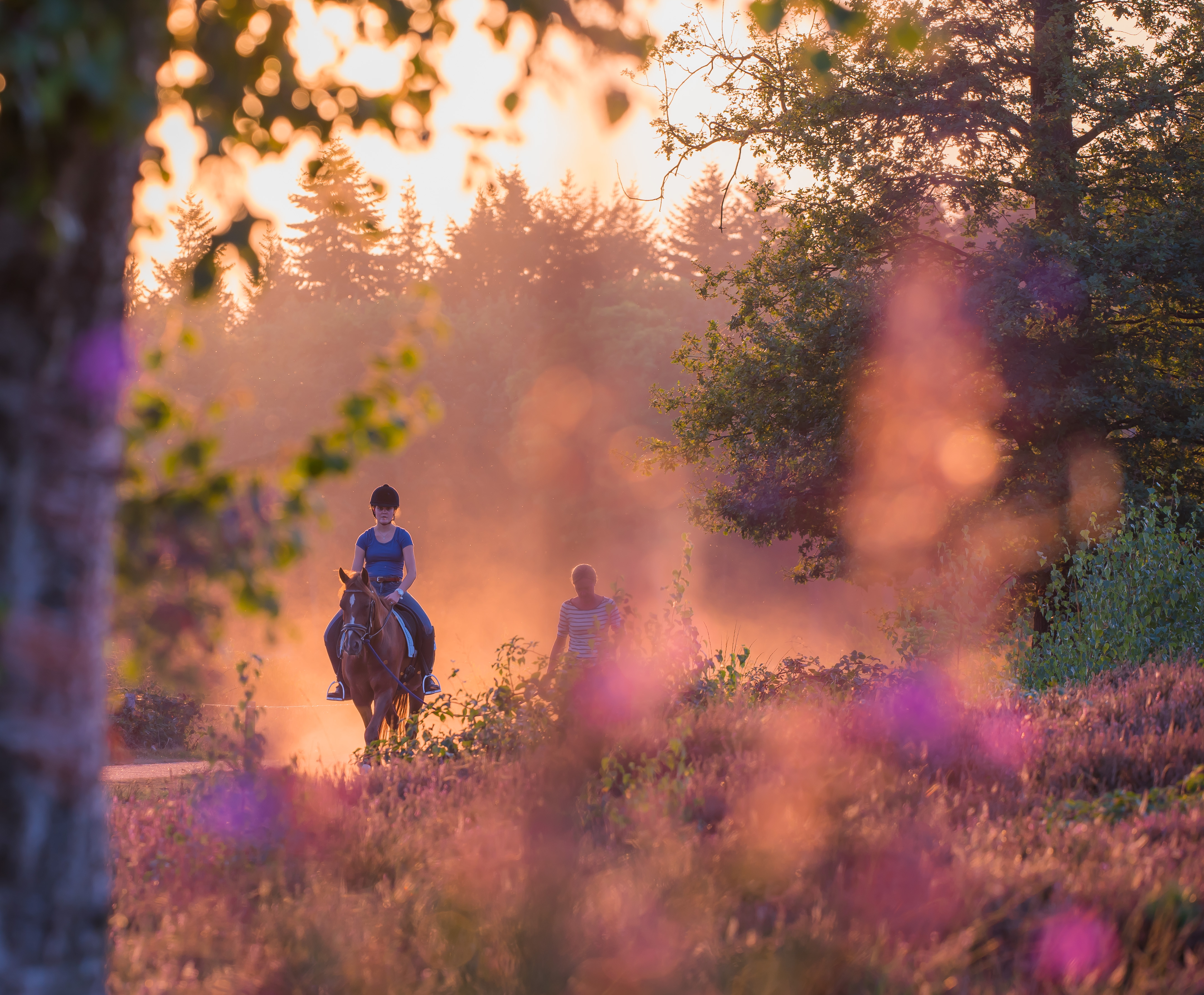 Ik was net aan het focussen op de paarse bloemen met de macrolens toen de jonge amazone aan kwam rijden, mooie stofwolk erachter, goed licht....